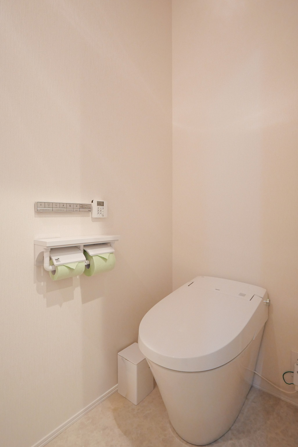 トイレ本体はタンクレスのLIXIL製を採用。手洗い背面にはセラールを施工し、水はねへの配慮とともに、石目調の素材感が空間のアクセントとなっています。