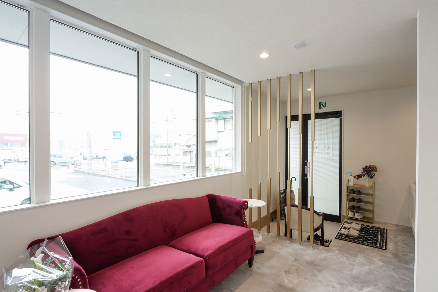お客様をお迎えする店舗として、空間全体の統一感と快適さに配慮して計画しました。待合室には大きなサッシを採用し、