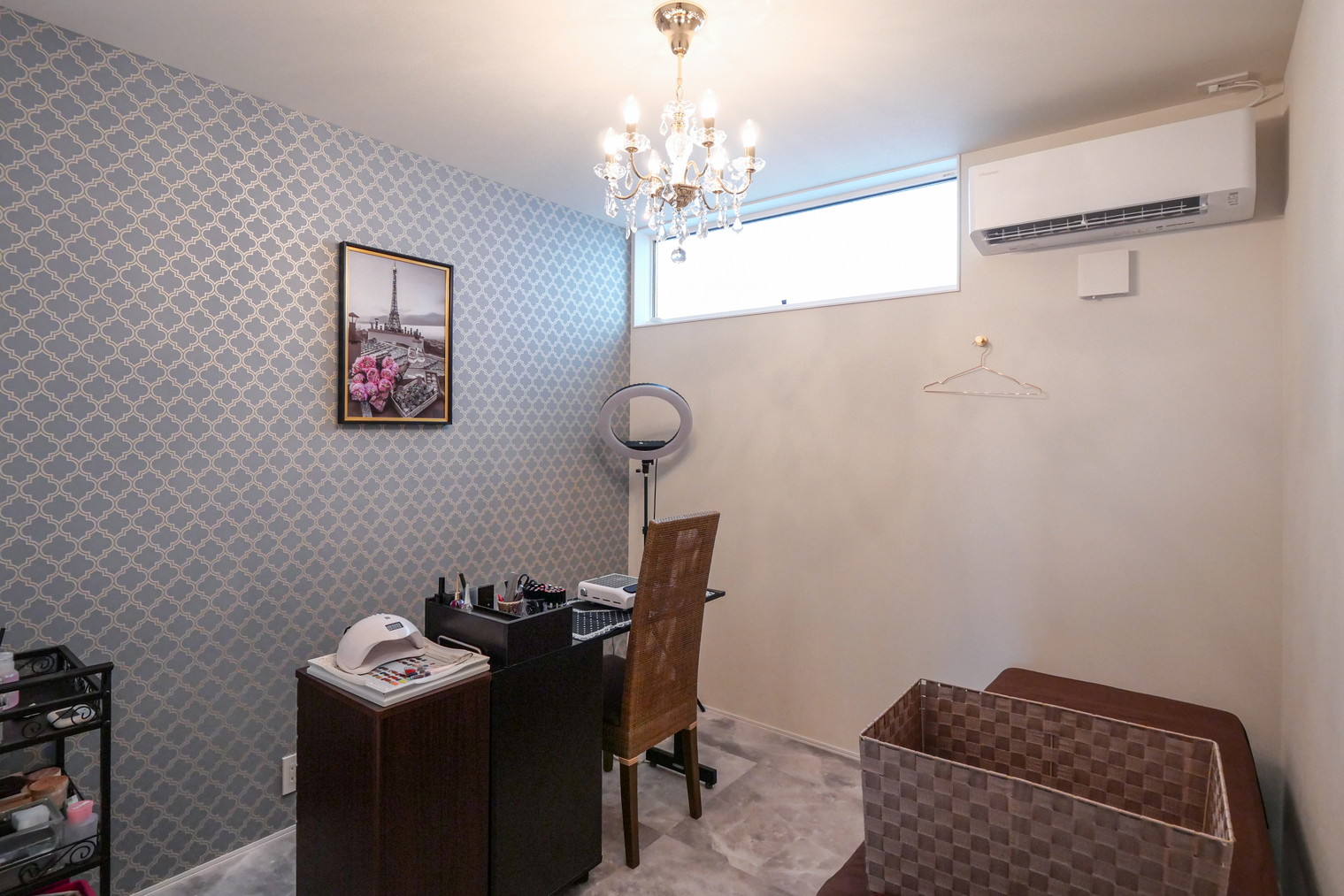 ネイルルームは明るく開放的な雰囲気を意識し、壁一面にアクセントクロスを採用。各施術室および待合室には天井スピーカーを設置し、心地よい音環境も整えています。