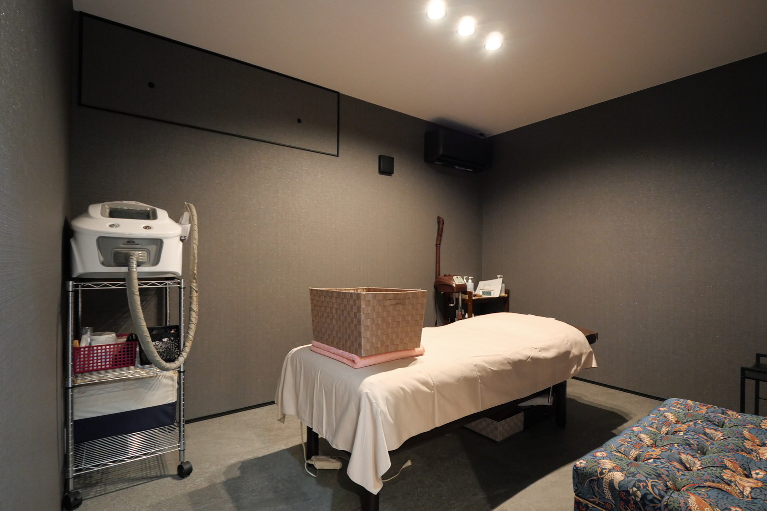 濃い色味でまとめた施術室は、リラックスできる穏やかな雰囲気に。