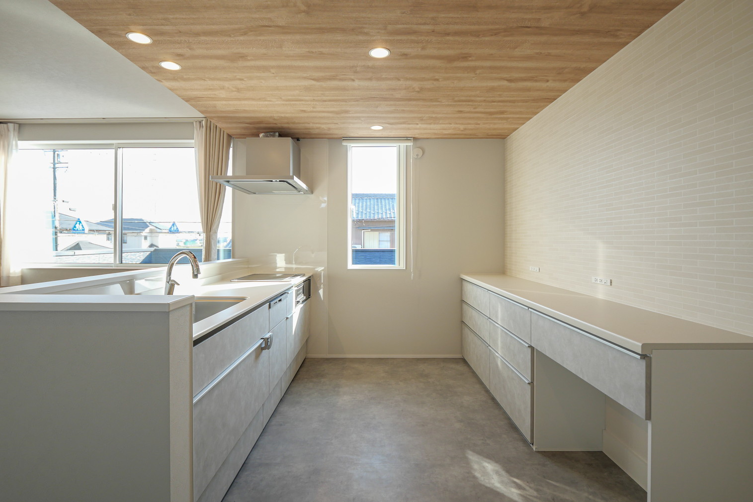 洗濯室には乾太くんを置ける造作カウンターを設置し、効率的な家事動線を実現。