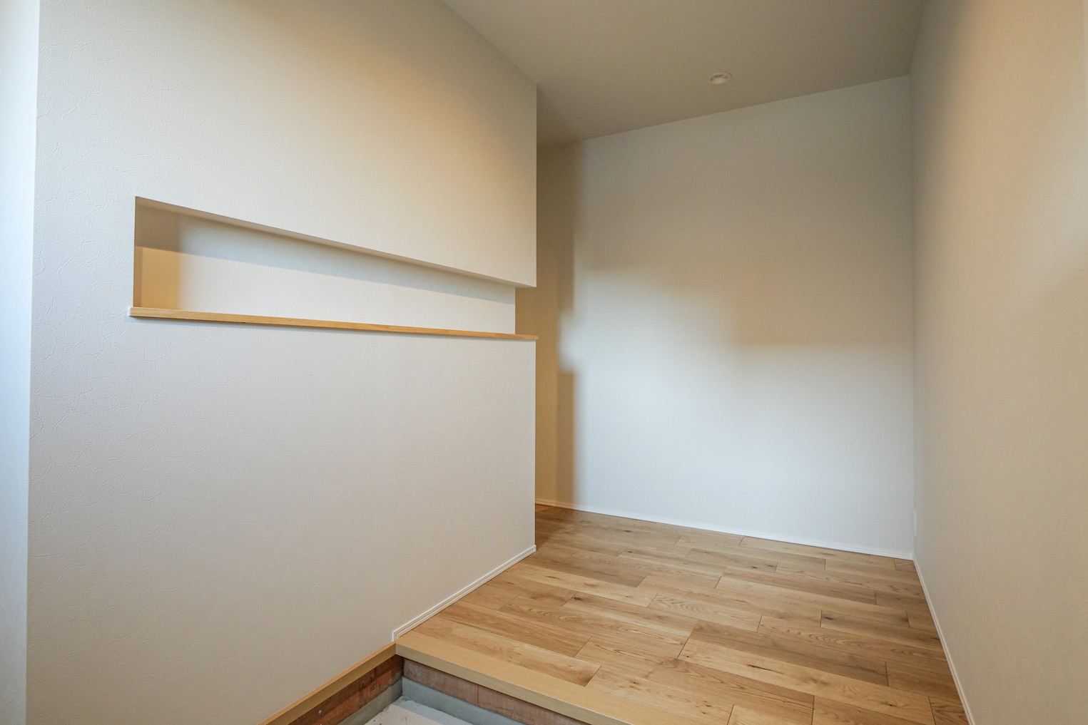1階の趣味室は、床材をアカシアに変更し、空間に温かみをプラス。 トイレ収納は既成品+造作を組み合わせ、見た目も使い勝手も両立しています。
