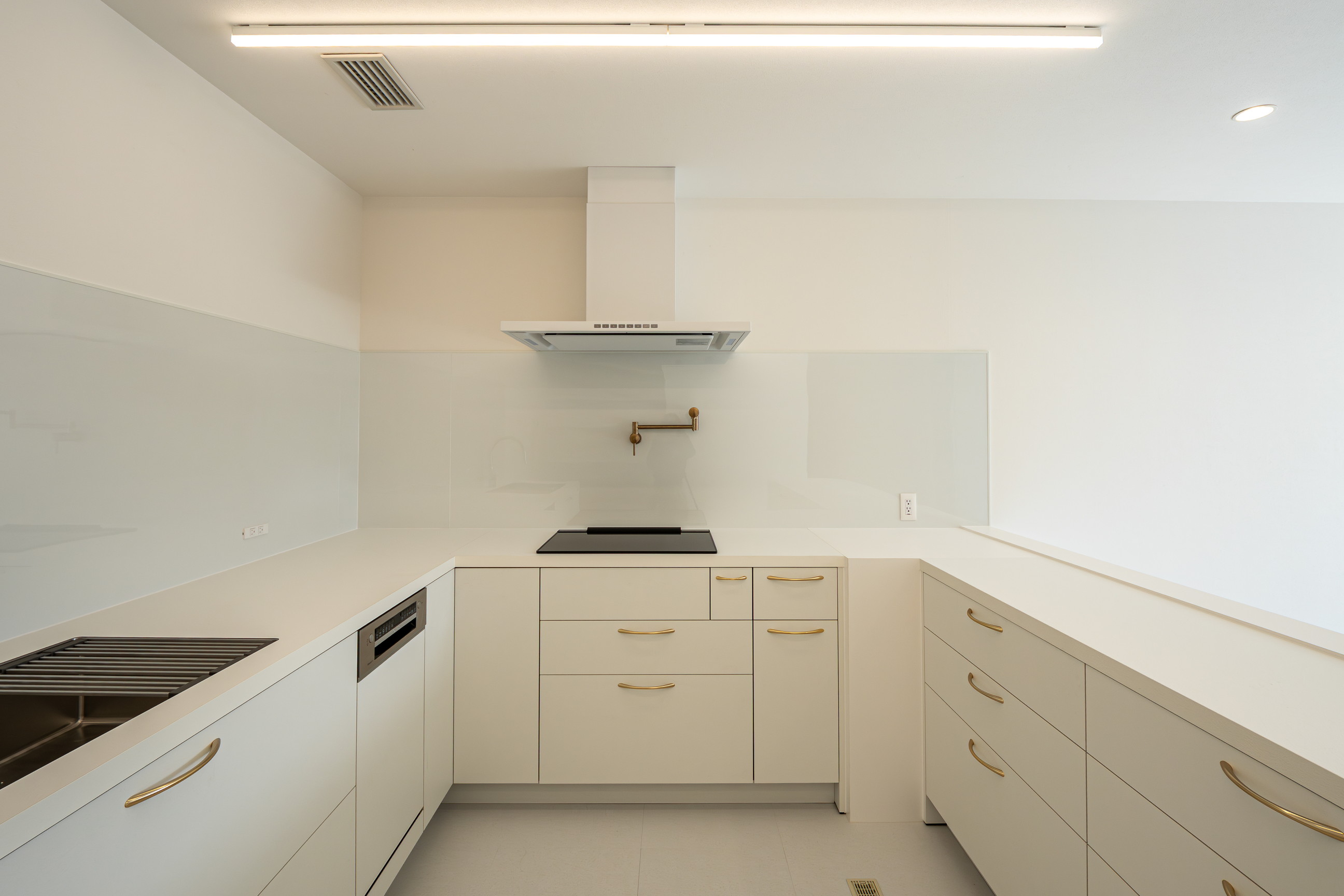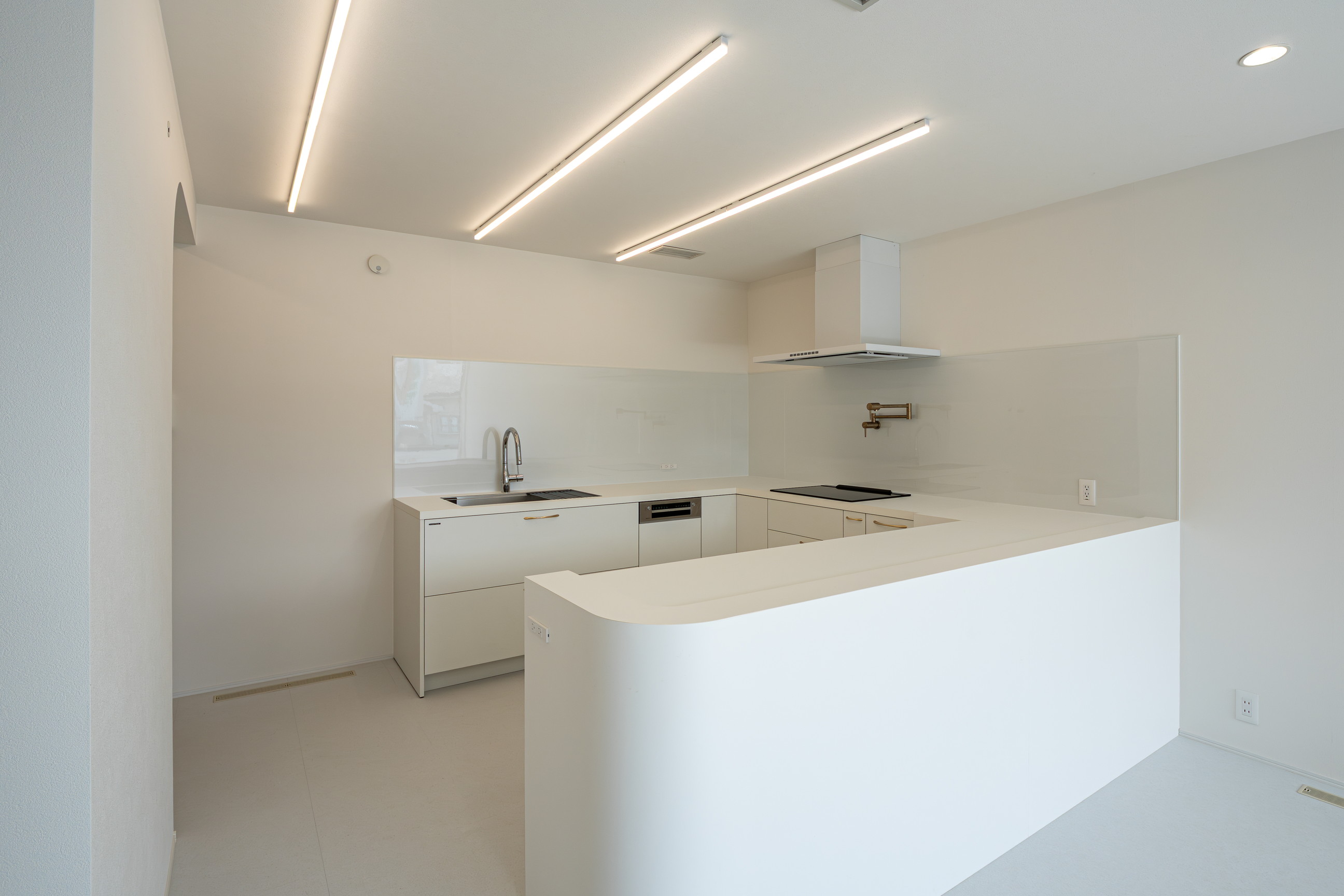 キッチンは白いグラフテクトを採用し、スタイリッシュなライン照明が空間のアクセントになっています。
