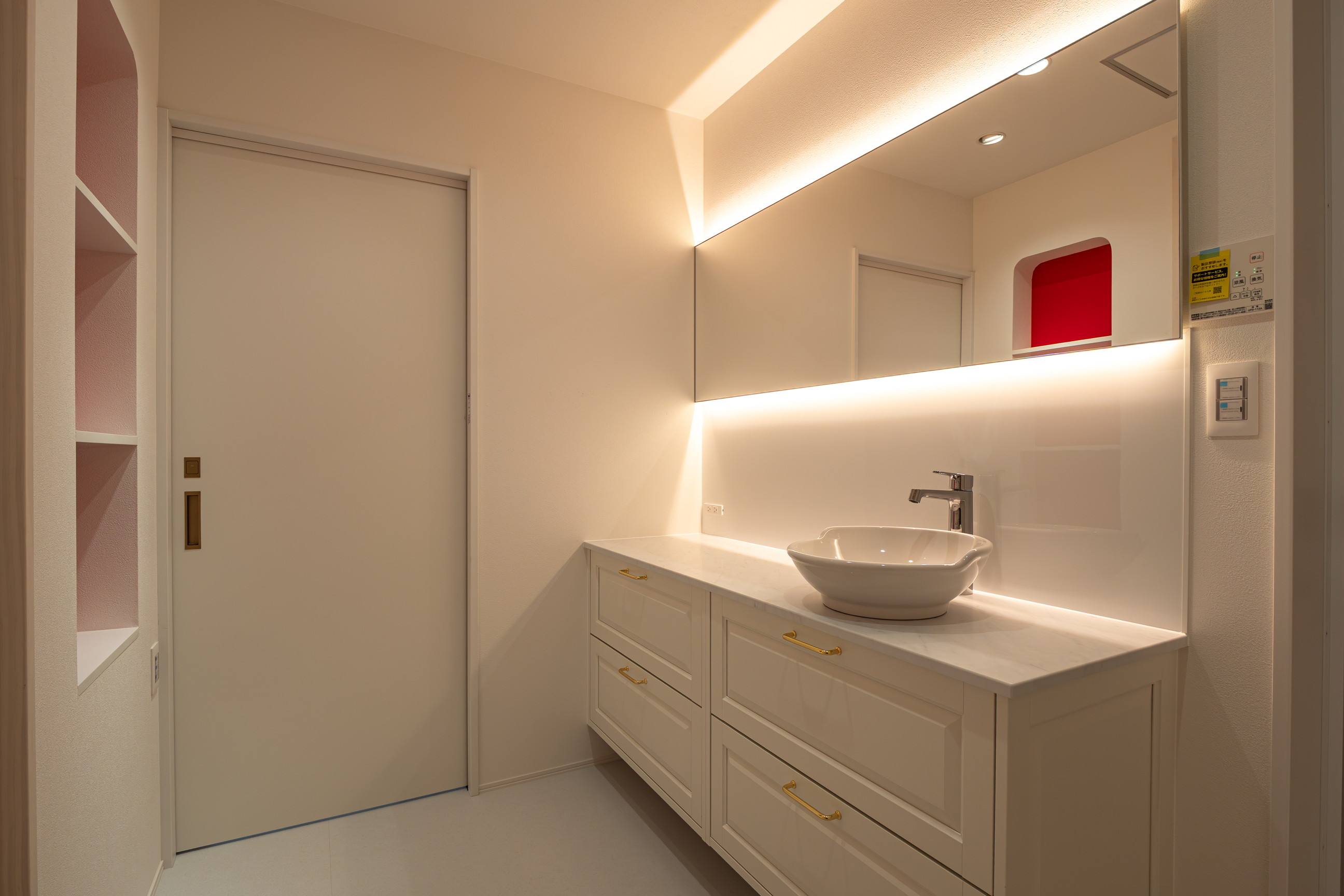 造作のアーチ型ニッチを設け、化粧水やコスメを美しく並べて楽しめるデザインにしました。