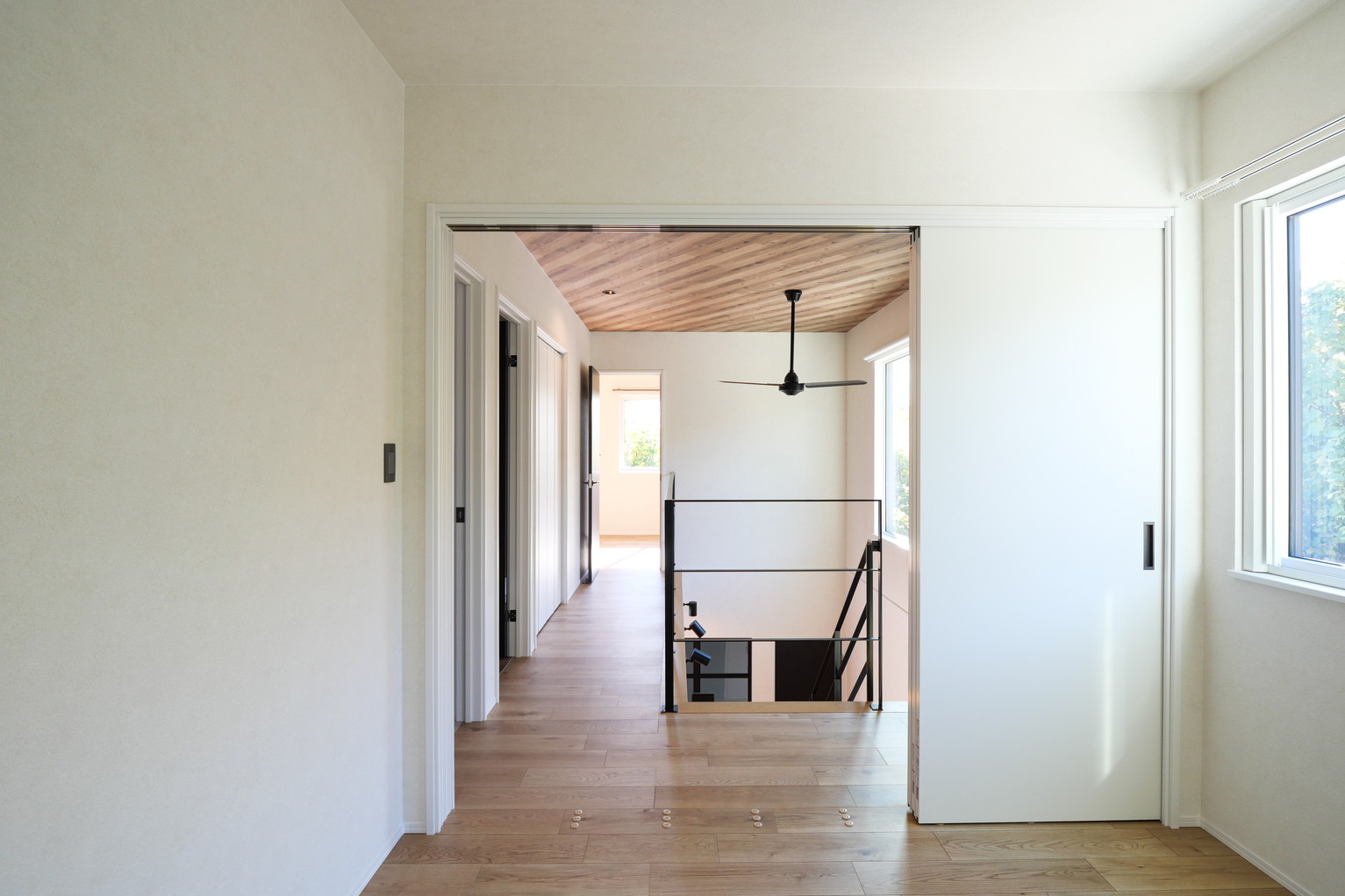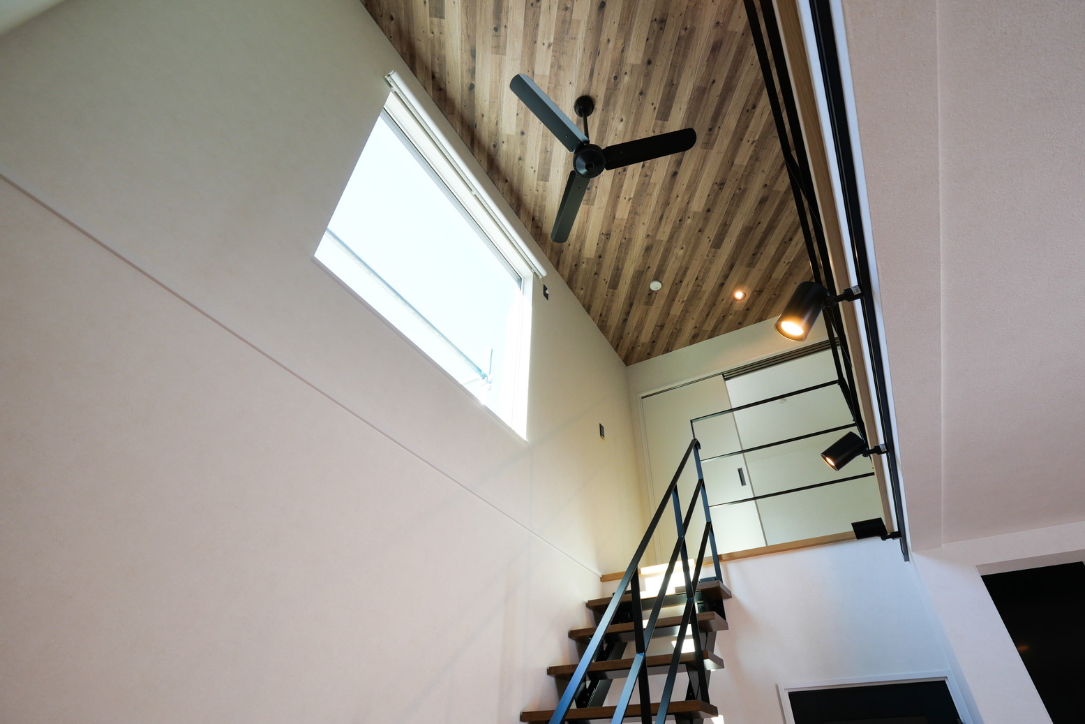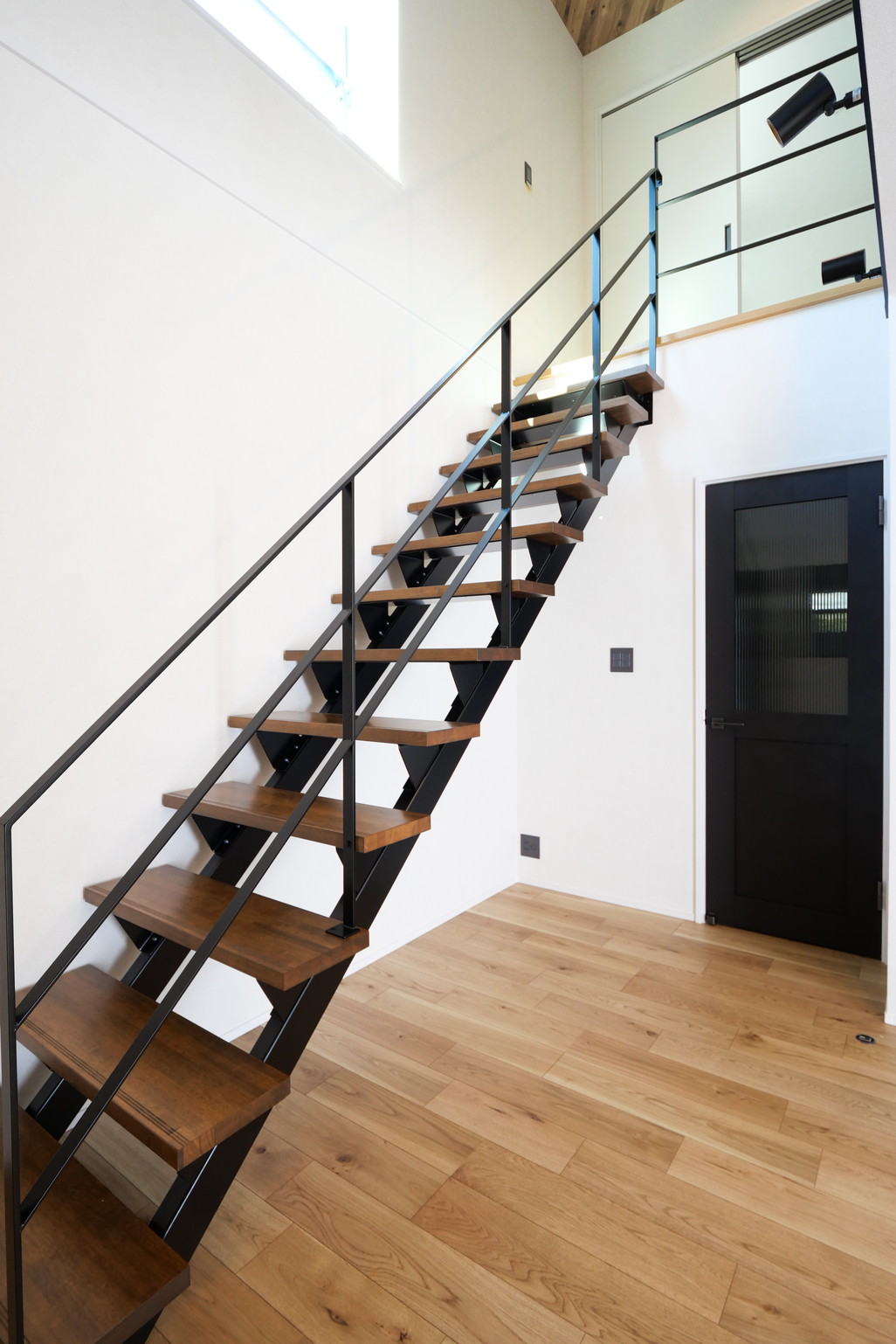 スタッフ『吹抜けから見る鉄骨階段、かっこいいですよね!吹き抜けの大きな窓から見える