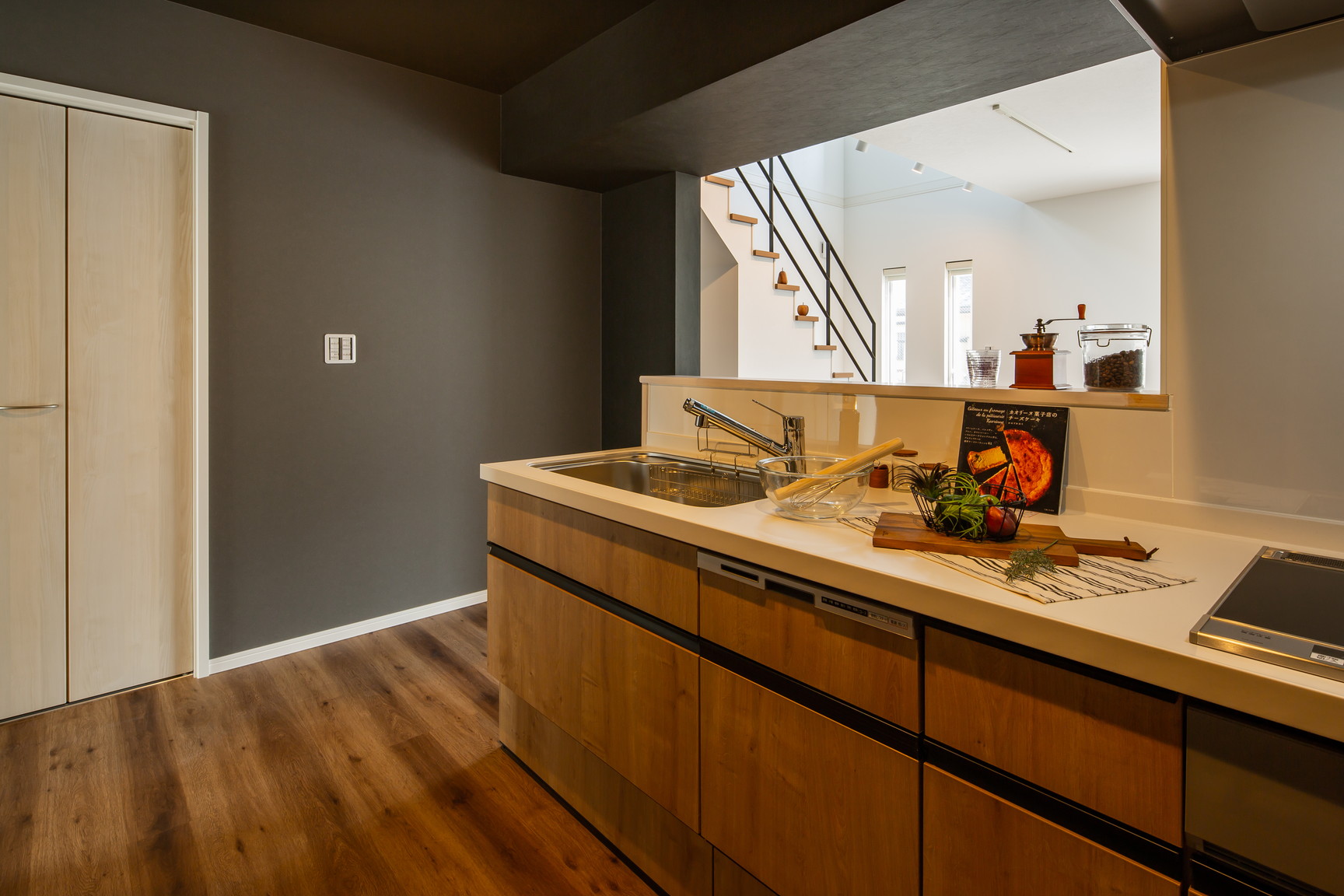 奥様:キッチンは標準のままで、カウンターのモルタルだけこだわりました。むしろキッチンは少し狭くしてリビングを広くしたかったんです。